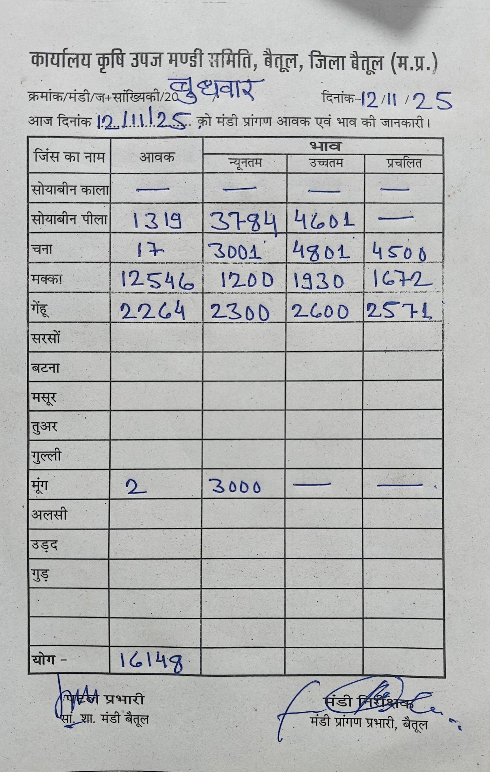 बैतूल। बुधवार 12 नवम्बर 2025 को बैतूल कृषि उपज मंडी में कुल 16148 क्विंटल उपज की आमद दर्ज की गई। आज के भावों में सोयाबीन और चने में तेजी देखने को मिली, जबकि मक्का के दाम कमजोर रहे।